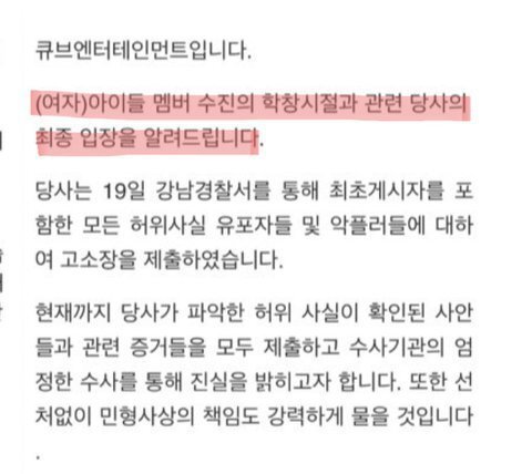 학교 폭력(학폭) 가해자란 의혹이 제기된 그룹 (여자)아이들 멤버 수진(본명 서수진)의 중학교 동창 배우 서신애가 'none of your excuse(변명 필요 없다.